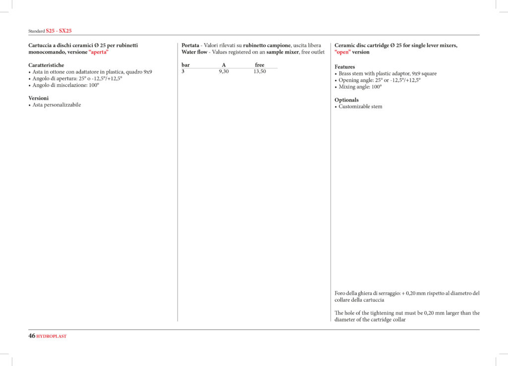 Cartuccia a dischi ceramici Ø 25 per rubinetti monocomando, versione “aperta”.